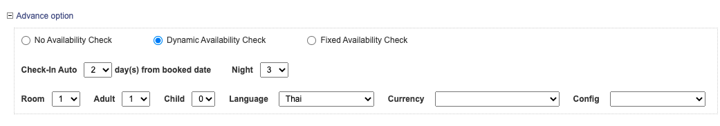 2. Dynamic Availability Check = สามารถกำหนดจำนวนคืนในการจอง , กำหนดการจองล่วงหน้า (เป็นจำนวนวัน) ได้ , กำหนดจำนวนห้อง และ จำนวนแขกผู้เข้าพักได้