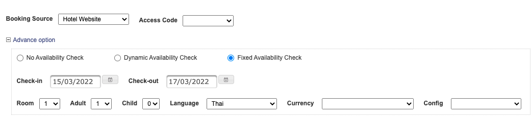 3. Fixed Availability Check = ลักษณะการทำงานจะคล้ายกับข้อ 2. Dynamic Availability Check เกือบทุกอย่าง สิ่งที่จะแตกต่างและเพิ่มขึ้นมาคือ สามารถกำหนดหรือบังคับวันที่ Check-in , Check-out ได้ ตัวอย่าง คลิก