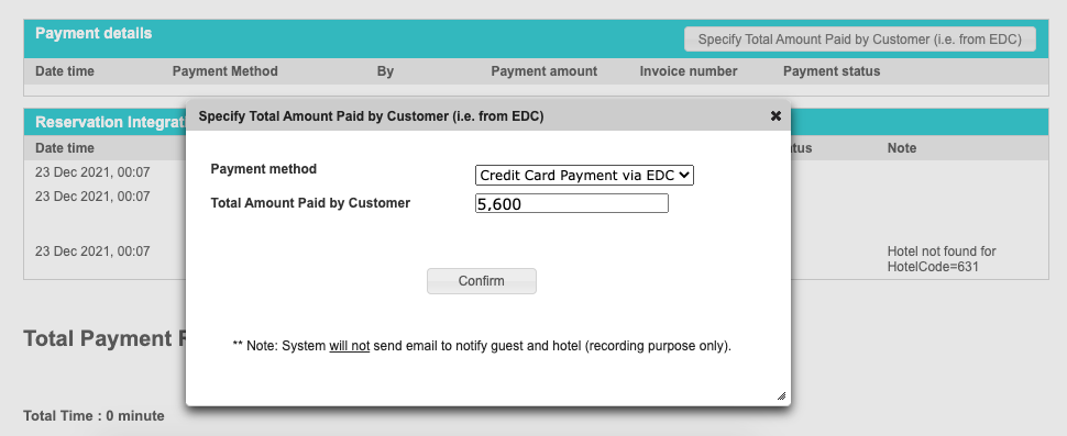 หลังจากกด View ที่หน้าแรกของ Reservation เข้ามาใน Booking แล้ว ให้เลื่อนลงมาจนเจอหัวข้อ Payment detail จากนั้นให้กดที่ปุ่ม Specify Total Amount Paid by Customer ซึ่งปุ่มนี้เมื่อกดแล้ว จะแสดงเป็น Pop-up ขึ้นมาแสดงตัวเลือกให้เจ้าหน้าที่กดยืนยันการรับเงิน ว่ายอดเงินได้ถูกตัดจากบัตรลูกค้าแล้วเป็นจำนวนเท่าไหร่ และ มาจากช่องทางไหน