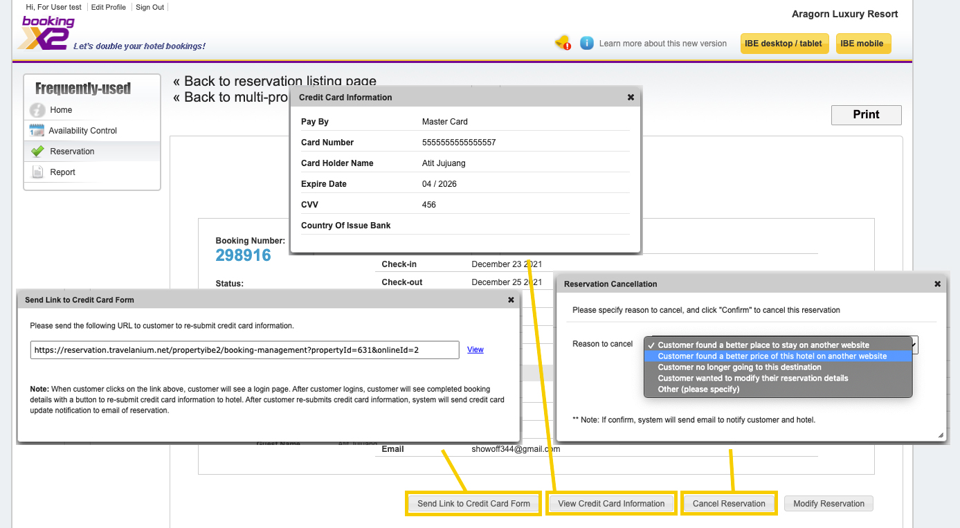 3. Cancel Reservation : เมนูนี้สำหรับการเข้ามาทำรายการยกเลิก โดยส่วนใหญ่ทางลูกค้าจะแจ้งเรื่องเข้ามาผ่านอีเมล หรือผ่านระบบที่ไว้ให้แก้ไขรายการจอง ซึ่งผู้ที่จะเข้ามาทำรายการยกเลิก จะเป็นเจ้าหน้าที่โรงแรม โดยให้ใส่เหตุผลไปด้วยว่า ยกเลิกเพราะอะไร โดยหลังจากกดปุ่มยกเลิกแล้ว จะมีอีเมลส่งไปยืนยันที่โรงแรม และ ลูกค้าพร้อมๆกัน