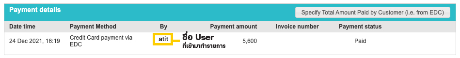 หลังจากกด Confirm เรียบร้อยแล้ว ระบบจะแสดงรายการนี้ว่า ชำระเงินเรียบร้อยแล้ว พร้อมแสดงชื่อ User หรือชื่อเจ้าหน้าที่ ที่เข้ามาทำรายการเพื่อเป็นการยืนยัน