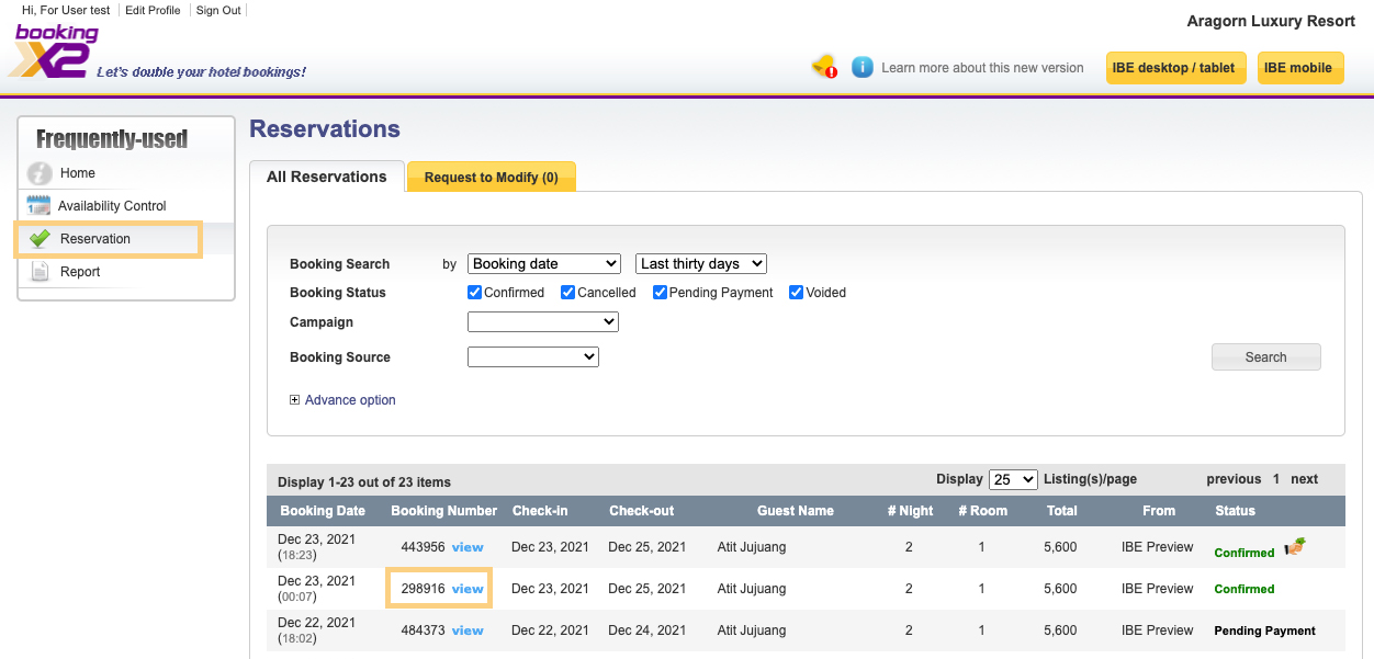 จากนั้นให้กลับไปที่เมนู Reservation อีกครั้ง จะพบว่า รายการ Booking ดังกล่าวจะขึ้นสัญลักษณ์
