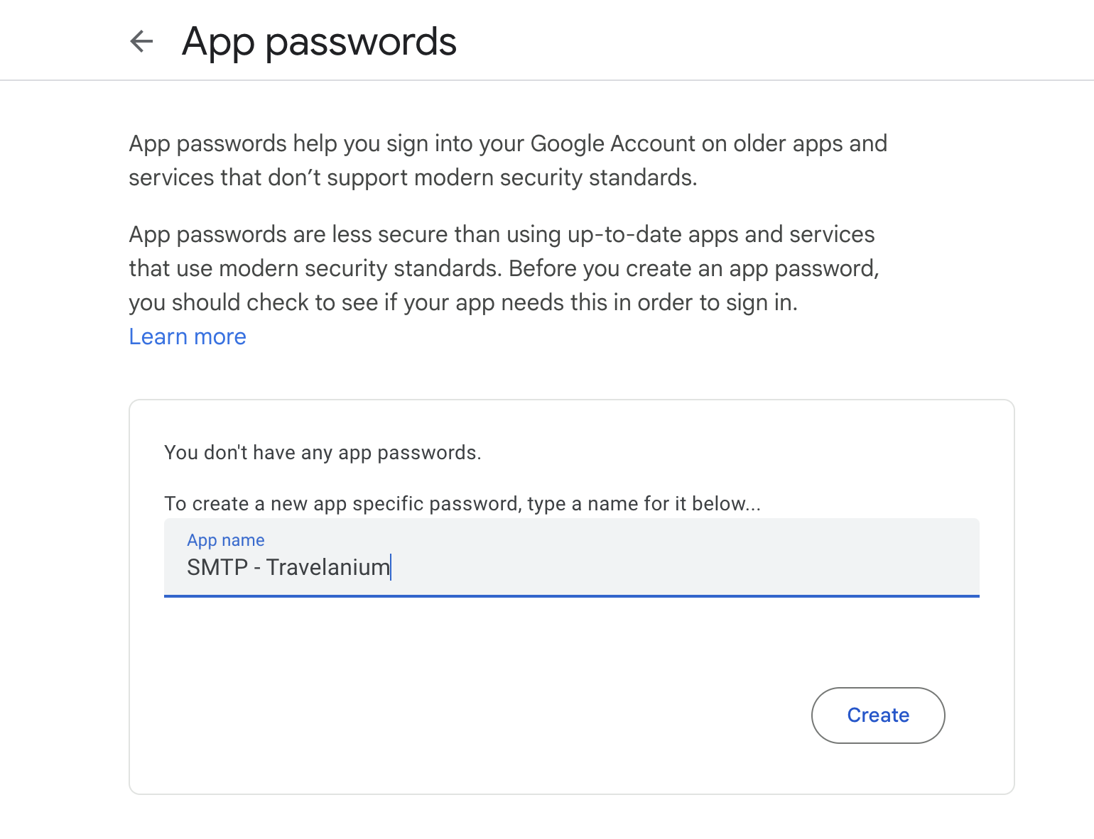 8. สร้างชื่อ App password (สามารถตั้งชื่ออะไรก็ได้ หรือตั้งตามตัวอย่างได้) จากนั้นกด Create
